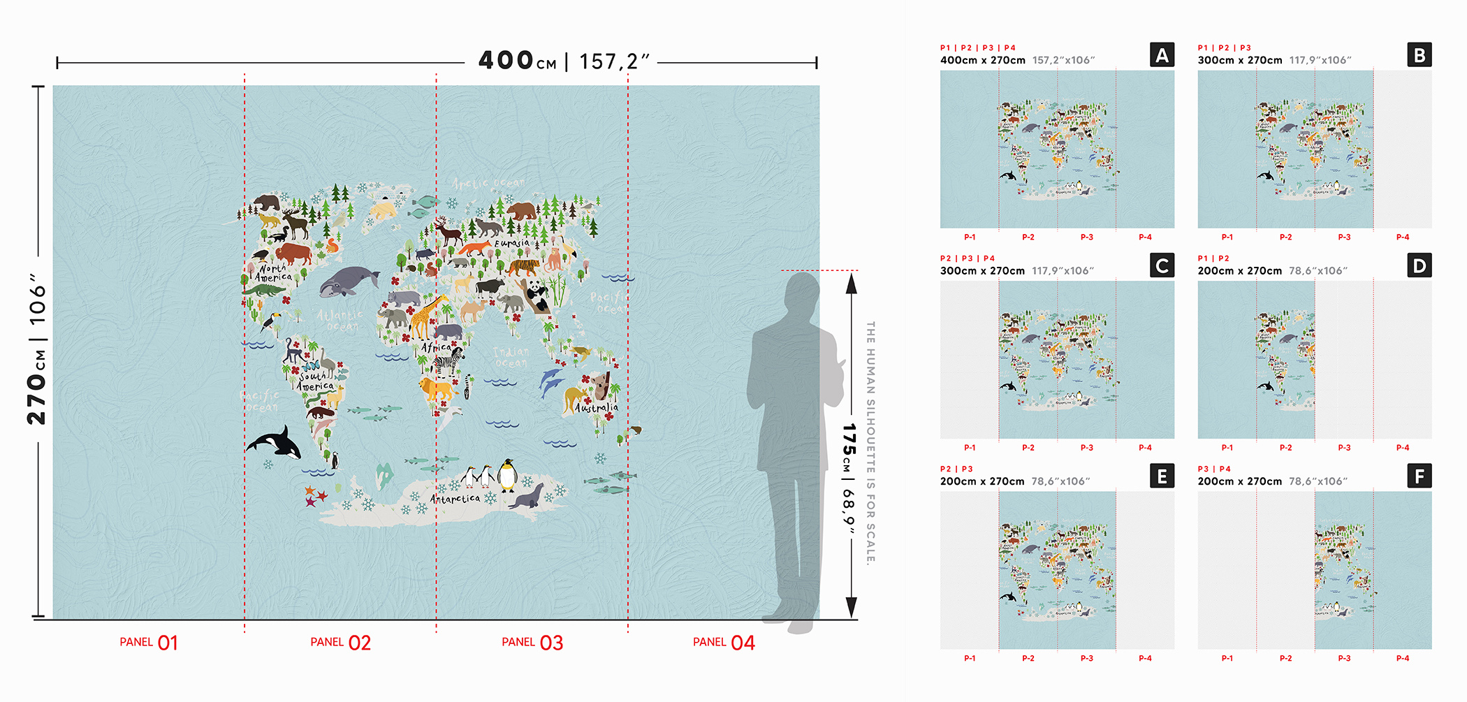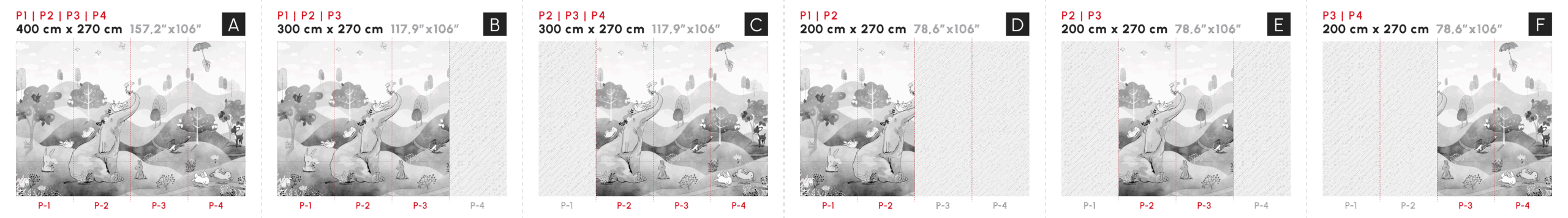 * The size of the wallpaper is 400 cm x 270 cm. It is produced in 4 piece as 104 cm x270 cm strips with 2 cm overlays on both sides.