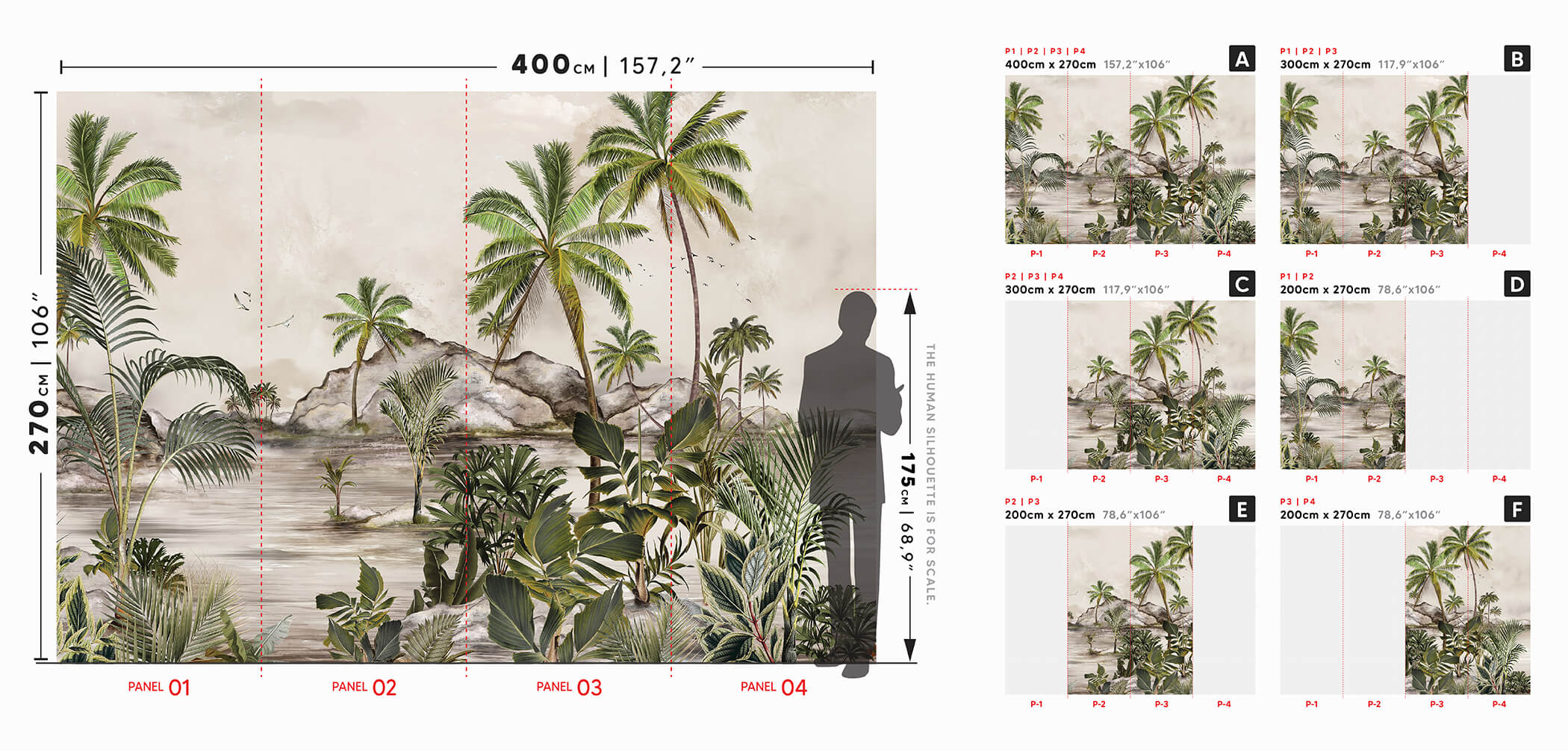 * The size of the wallpaper is 400 cm x 270 cm. It is produced in 4 piece as 104 cm x270 cm strips with 2 cm overlays on both sides.