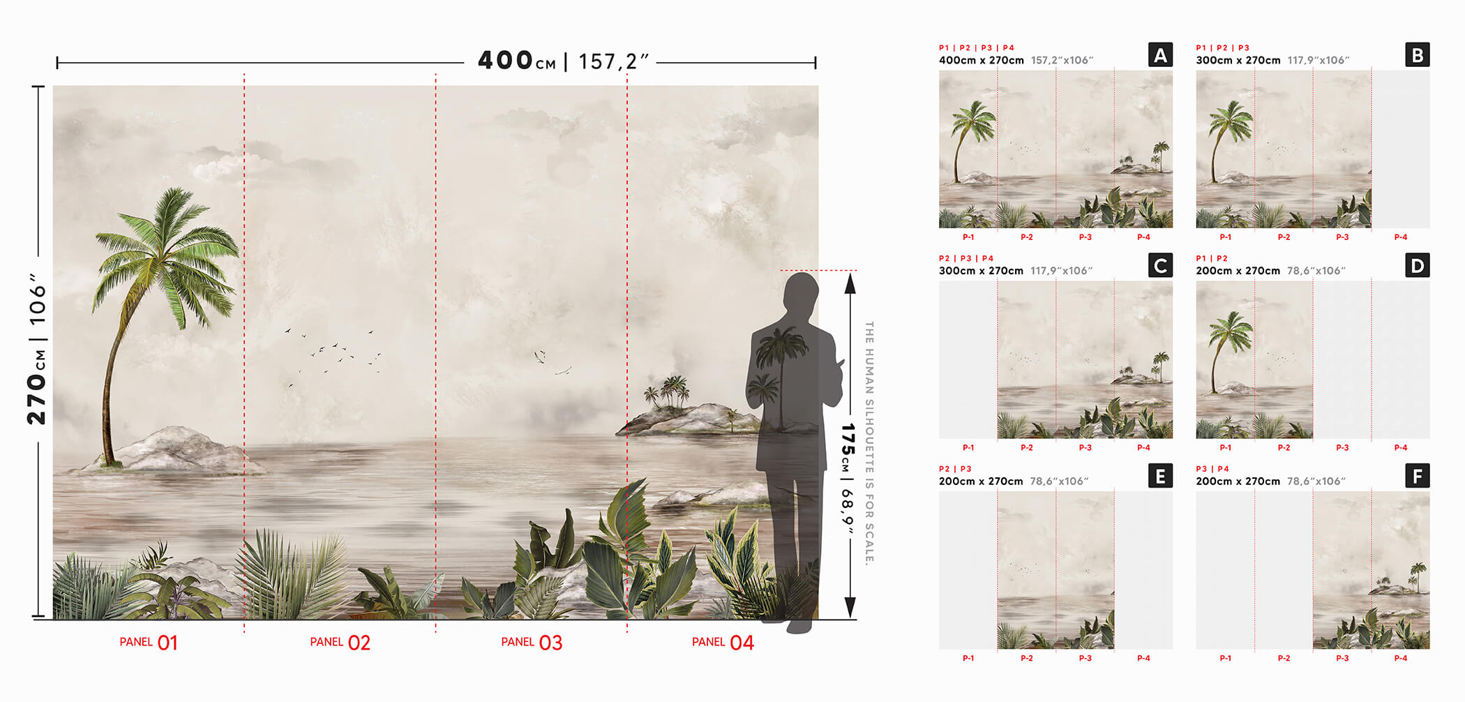 * The size of the wallpaper is 400 cm x 270 cm. It is produced in 4 piece as 104 cm x270 cm strips with 2 cm overlays on both sides.