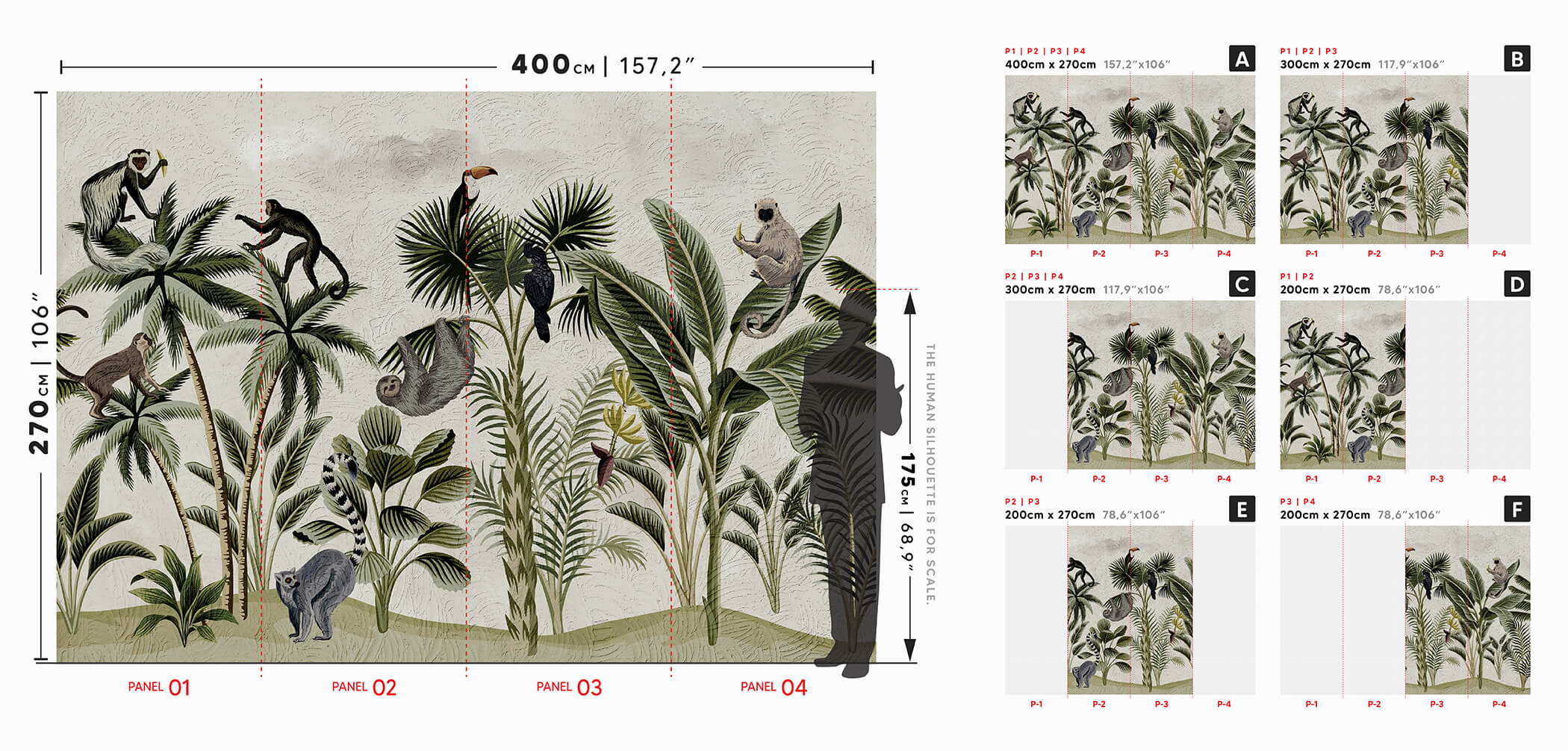 * The size of the wallpaper is 400 cm x 270 cm. It is produced in 4 piece as 104 cm x270 cm strips with 2 cm overlays on both sides.