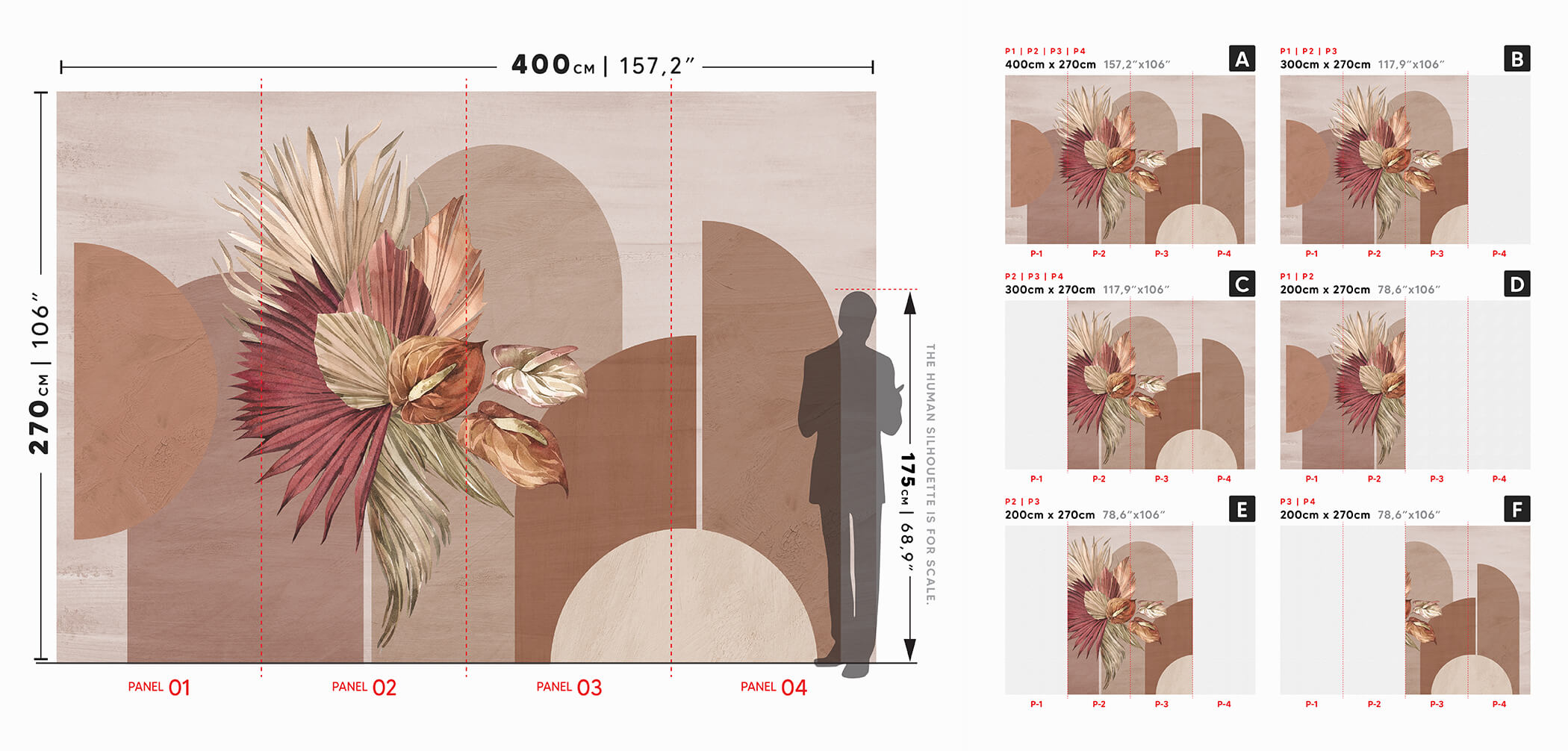 * The size of the wallpaper is 400 cm x 270 cm. It is produced in 4 piece as 104 cm x270 cm strips with 2 cm overlays on both sides.
