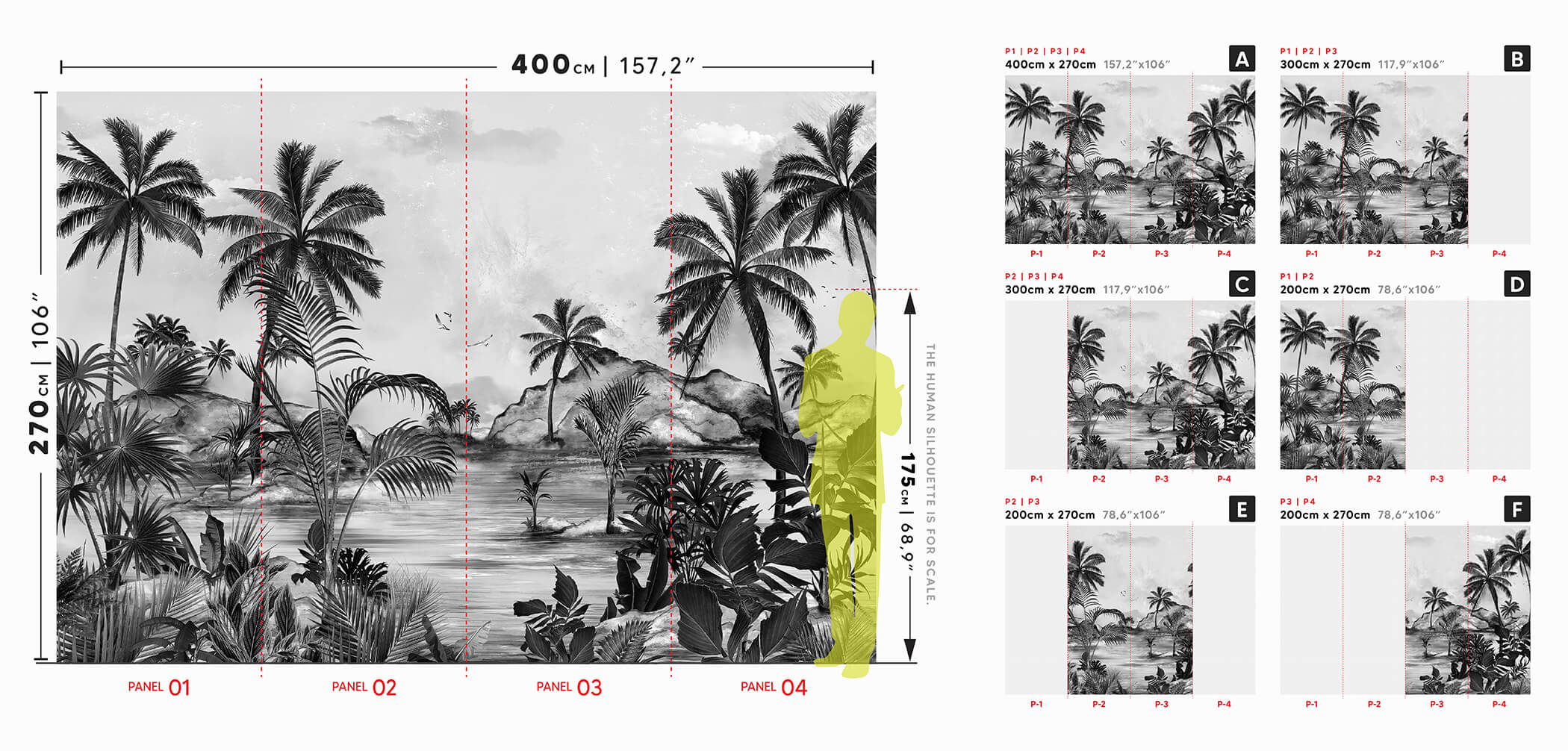 * The size of the wallpaper is 400 cm x 270 cm. It is produced in 4 piece as 104 cm x270 cm strips with 2 cm overlays on both sides.