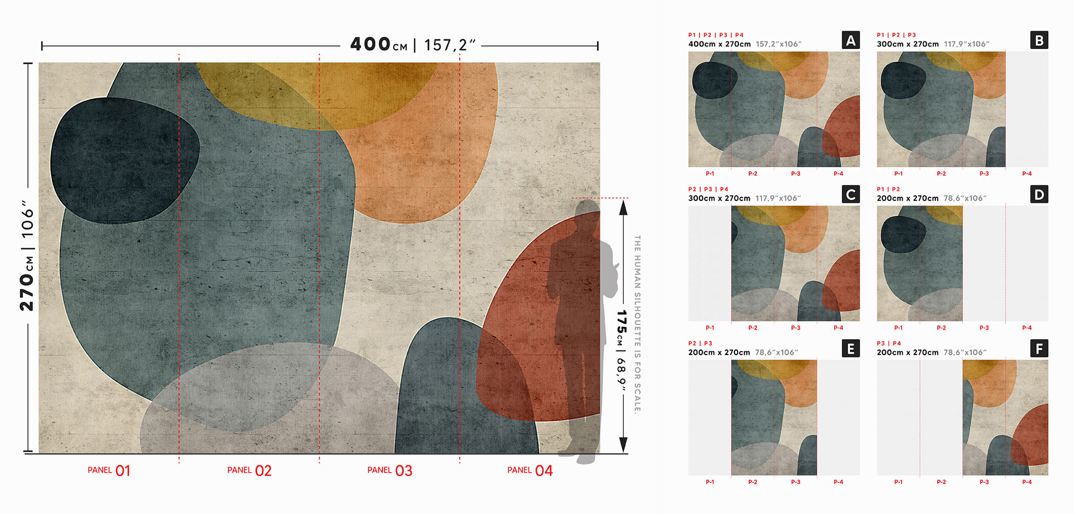 * The size of the wallpaper is 400 cm x 270 cm. It is produced in 4 piece as 104 cm x270 cm strips with 2 cm overlays on both sides.