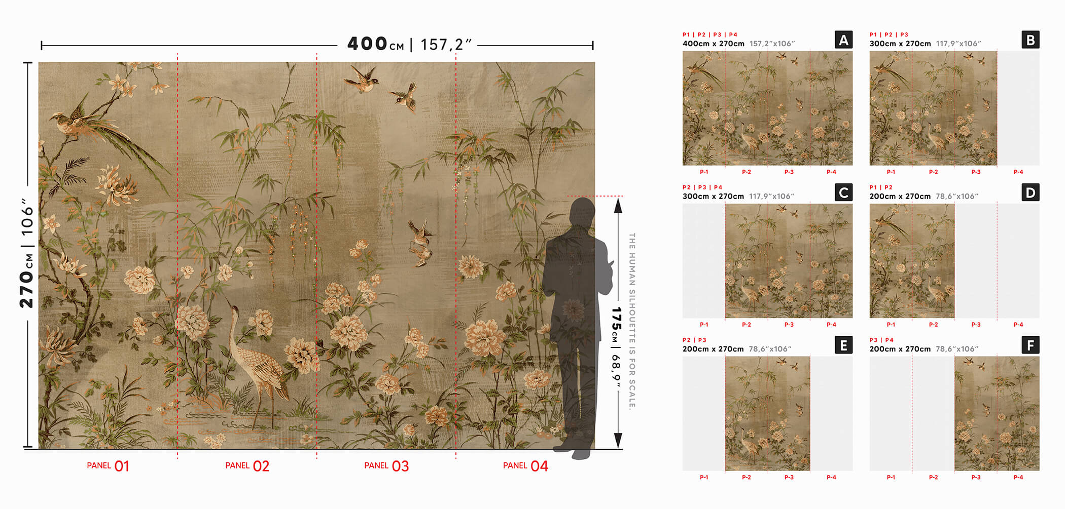 * The size of the wallpaper is 400 cm x 270 cm. It is produced in 4 piece as 104 cm x270 cm strips with 2 cm overlays on both sides.